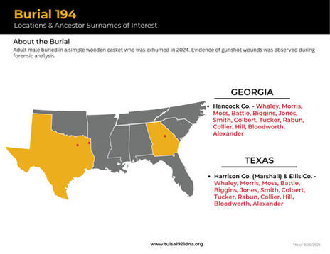 Below are the surnames and locations of interest for some of the burials that are in the genetic genealogy process. We encourage you to look through the surnames and locations to see if you recognize any surname from your own family tree.